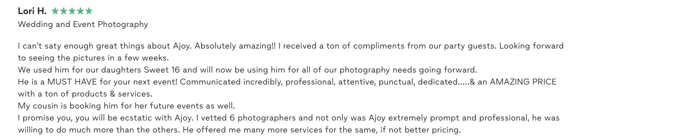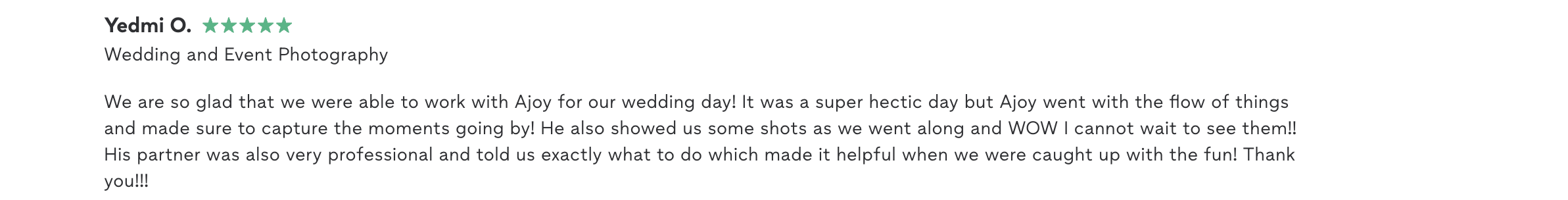 Working with Ajoy was an absolute pleasure. His work as a photographer is excellent. You can really tell he loves what he does…it shines through his work. We were stunned by how beautiful our wedding photos came out, and we highly recommend him. Thank you again Ajoy for all the memories!
