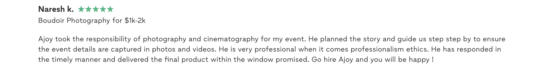 Ajoy is an immense pleasure to work with. We hired him to shoot a Gender Reveal Video. I had a very tight turnaround time or they needed a video in less than a week and he did not hesitate. In just 72 hours he produced a 4K high resolution cinematic video that I shared with my family and friends. It was so beautiful many people cried from joy LOL.